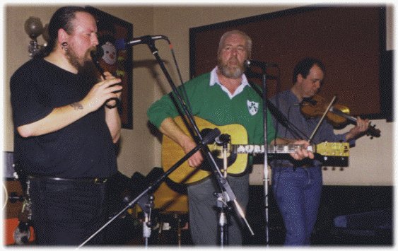 This photo was taken inWolverhampton in 1999 Noel, John on whistle and Andy Jones, of Drowsy Maggie, on fiddle.